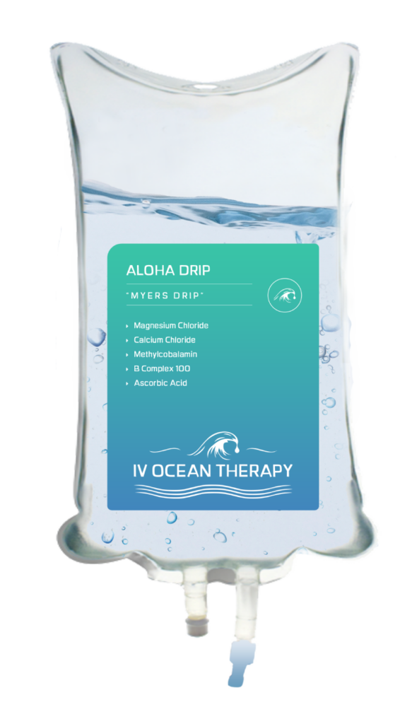 Invest in your well-being with our Aloha Drip (Myers Cocktail) mobile IV service. Replenish your body with essential vitamins, nutrients, and minerals including Magnesium Chloride, Calcium Chloride, Methylcobalamin (B-12), B Complex 100, and Ascorbic Acid (Vitamin C).