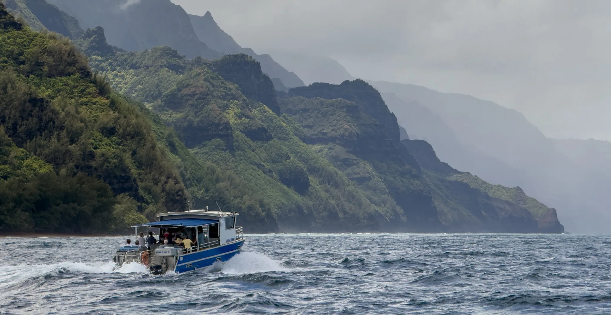 Experience the dramatic winter beauty of Kauai’s Na Pali Coast departing from Hanalei Bay. This approximately 3-hour catamaran tour offers stunning views of sea cliffs, hidden valleys, waterfalls, and pristine beaches.