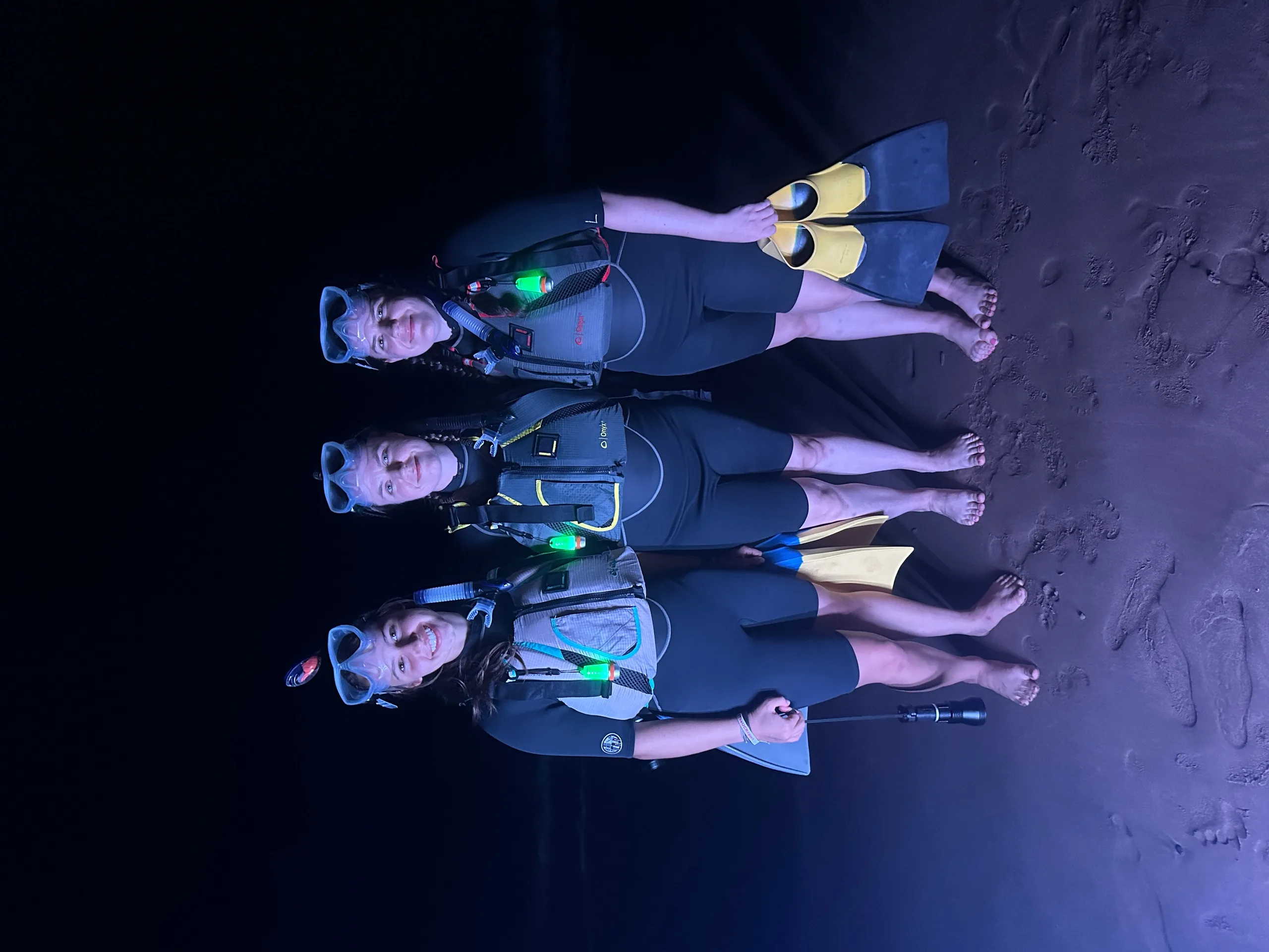 Safety is prioritized with high-end masks, dive lights, life preservers, and a red safety beaker for each participant. The guide uses a 4000-lumen multi-colored main light to illuminate the area.