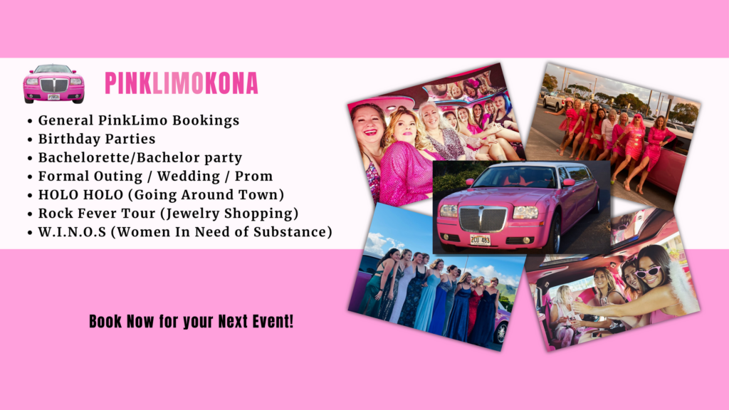 Book Now to elevate your Kona experience with Pink Limo Tours. Enjoy luxury, comfort, and style as you explore the beauty of Hawaii’s Big Island!