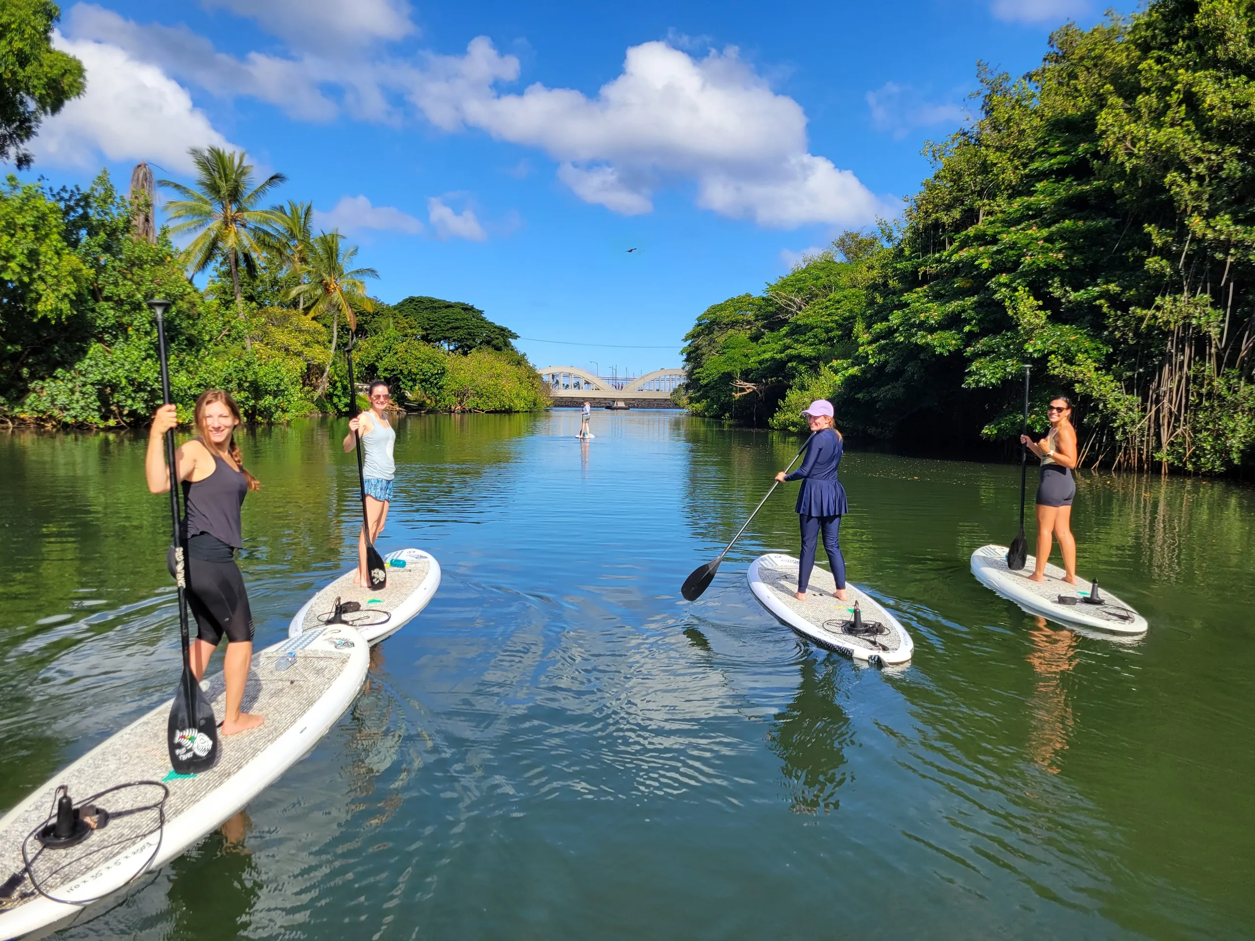Sunrise Paddle in Haleiwa is a beginner-friendly guided morning paddle down the Anahulu River with chances to see Hawaiian Green Sea Turtles. The 1.5-hour session includes a paddleboard lesson and is suitable for all experience levels.