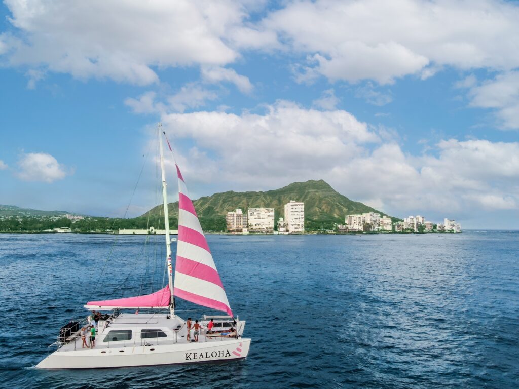 Experience the magic of a Hawaiian sunset from the comfort of the Kealoha catamaran. Reserve your spot now for an unforgettable evening on the Waikiki Coastline.