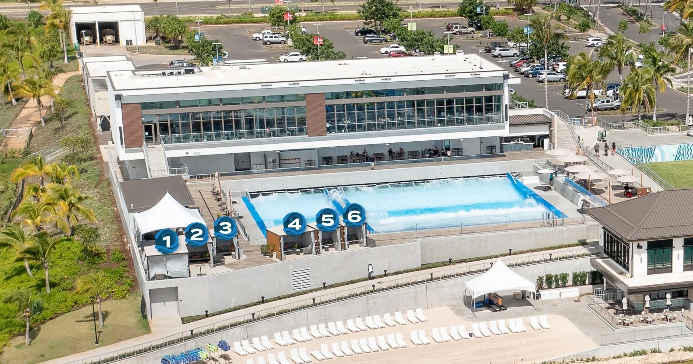Located near the Wai Kai Wave, the cabanas offer exceptional views of the lagoon and Pacific Ocean, ideal for watching surfers or sunsets. Two sizes are available: Large Surfside Cabana for up to 8 people and Small Surfside Cabana for up to 6 people.