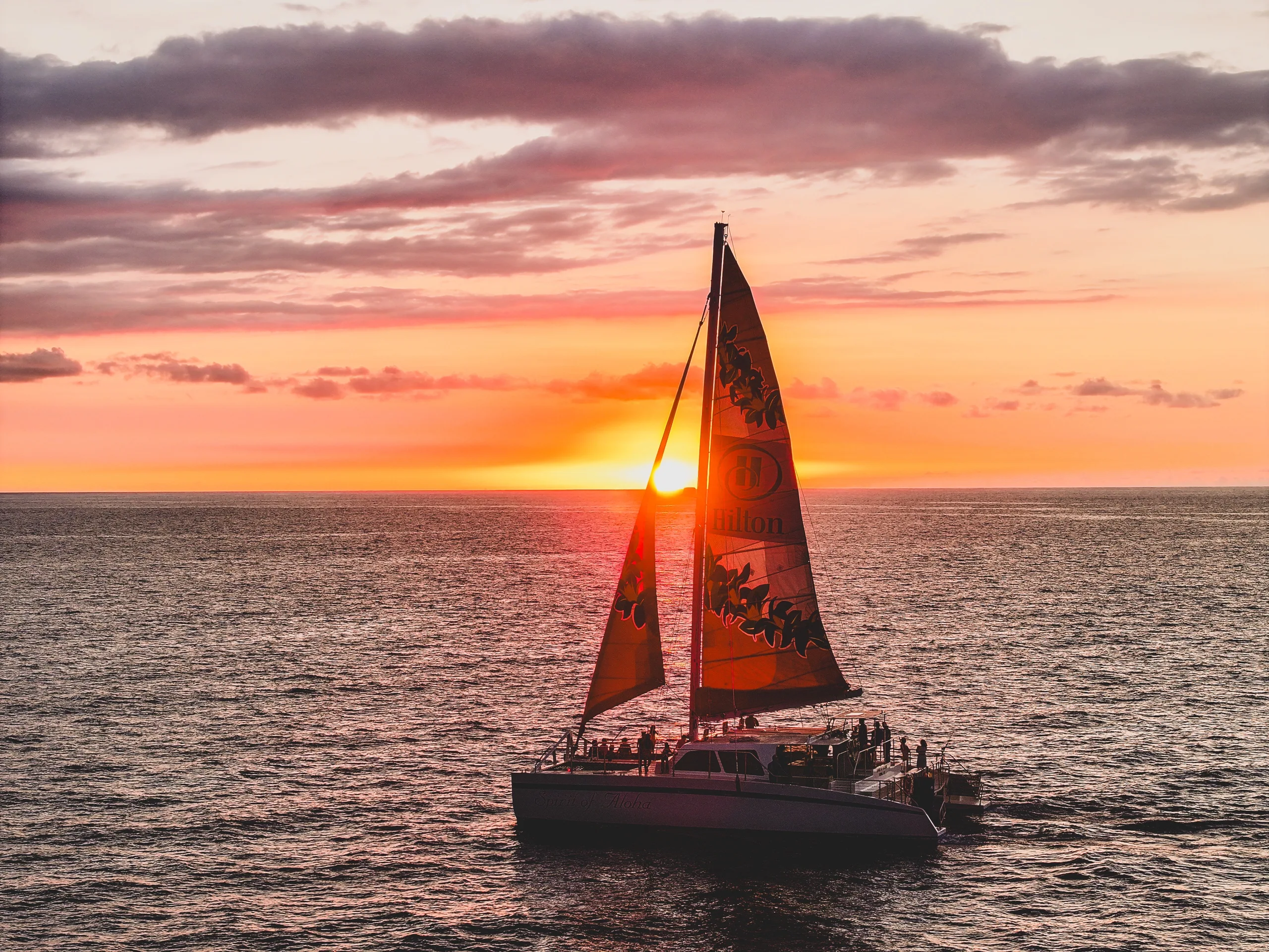 Waikoloa Signature Sunset Sail offers a 1.5-hour evening cruise along the Kohala Coast from Anaeho’omalu Bay. Enjoy tropical cocktails, light bites, and panoramic island views.